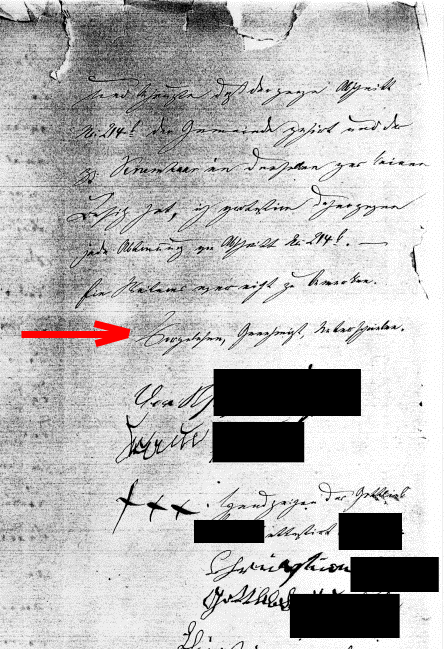 Der vorliegende Auszug enthält den abschließenden Teil - "Vorgelesen, Genehmigt, Unterschrieben." einer Grenzverhandlung, also die Unterschriften der beteiligten Personen. Das Besondere ist hier, die Unterzeichnung eines Beteiligten mit "3 Kreuzen", nebst Attestierung dieses Handzeichens durch den Verhandlungsführer. Jetzt weiß man, dass der Ur-Ur-Urgroßvater nicht schreiben konnte, aber was hat er denn mit seinen "3 Kreuzen" unterzeichnet ? Positiv oder negativ für die Nachfahren ?? ( Aus Datenschutzgründen wurden die Nachnamen in nebenstehendem Dokument geschwärzt.) | ||
